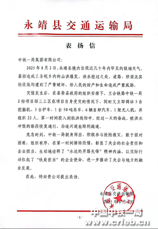 8月4日,中鐵一局蘭合鐵路項目三工區收到永靖縣交通運輸局表揚信,對項目在極端災情面前挺身而出、主動擔當的鐵軍精神給予高度肯定,稱贊項目以實際行動深化了企地融合發展,為地方搶險救災工作作出重要貢獻。
