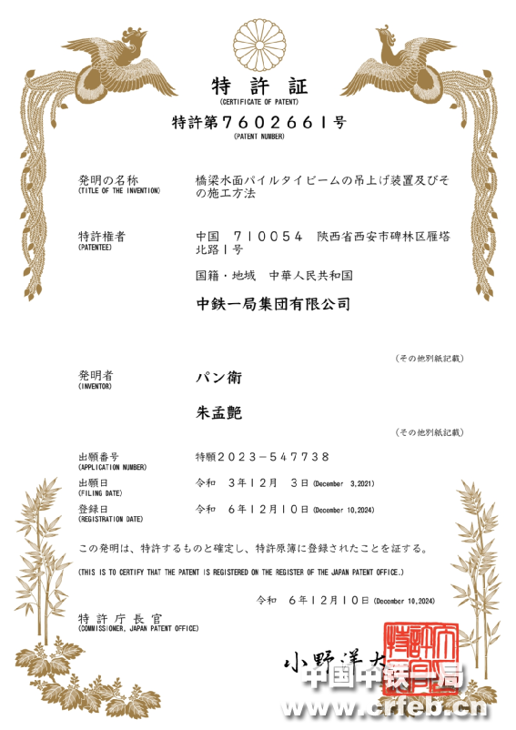 三公司研發的《一種橋梁水面樁系梁的吊裝裝置及其施工方法》,通過吊桿+調節螺母的機械升降結構與分階段模板安裝方法,解決了現有技術中工序復雜、成本高、污染風險大的問題。憑借在提升水上橋梁施工安全性和效率方面的突出優勢,先后獲評國家發明專利、實用新型專利以及日本發明專利。此次被確定為行業高推廣價值三等專利,是三公司在該獎項上的首次突破,為企業在專利轉化與推廣應用方面贏得了更廣闊的發展空間。