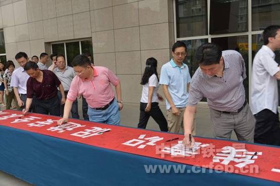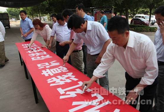 5月30日上午,中南鐵路通道項目經(jīng)理部在山西長治舉行2014年安全生產(chǎn)月啟動儀式。圖為項目員工在橫幅上簽名