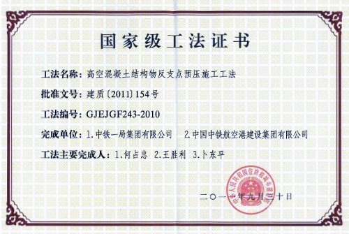 由我公司完成的“高空混凝土結構物反支點預壓施工工法”被評為國家級工法。