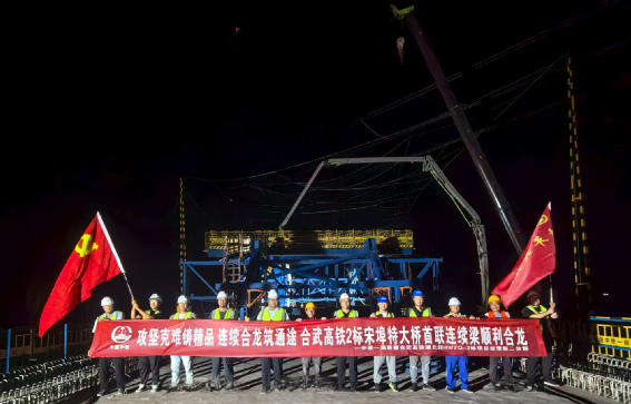 湖北麻城訊:9月8日凌晨2時,中鐵一局承建的合武高鐵2標(biāo)宋埠特大橋施工現(xiàn)場燈火通明、煙花齊放。隨著最后一方混凝土澆筑完成,該橋跨干沙河290號-293號墩(40+64+40)米首聯(lián)連續(xù)梁順利實現(xiàn)合龍,標(biāo)志著合武高鐵建設(shè)取得又一重大階段性進展。