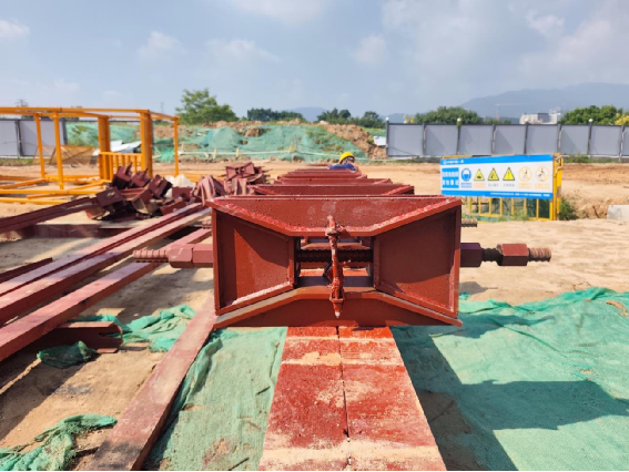 橋梁鋼管立柱卸落裝置:項目部在橋梁鋼管立柱頂部設置卸落裝置,卸落裝置采用側向調節方式,通過一根φ32精軋螺紋鋼配套四個套筒來調節高度,最大可調節10cm,相比較傳統沙箱受壓易凹陷、支架標高不穩定等問題,該裝置具有調節精度高、結構剛度大、安拆操作便捷、防水防潮耐用等特點,且能夠精準修正支架在荷載作用下的沉降誤差,有效提高材料利用率。