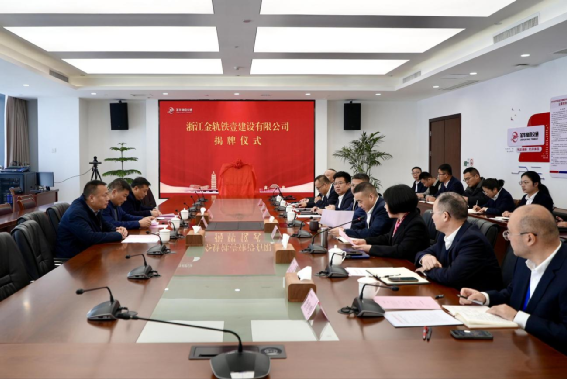 金華市國資委宣讀公司成立批復文件;出席活動的領導共同揭牌,紅綢緩緩落下,“浙江金軌鐵壹建設有限公司”的牌匾赫然在目,現場響起了熱烈的掌聲。