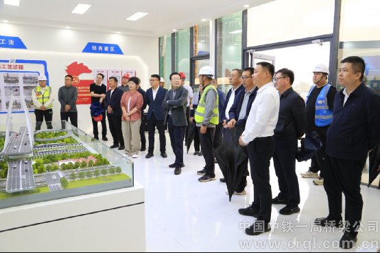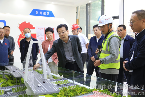 在施工現(xiàn)場,蘇世強(qiáng)一行聽取了中鐵一局項(xiàng)目負(fù)責(zé)人程曉剛關(guān)于項(xiàng)目概況、建設(shè)意義、施工進(jìn)度、重難點(diǎn)推進(jìn)情況等方面的匯報,饒有興味地參觀了工地現(xiàn)場的智慧中心,觀看了轉(zhuǎn)體橋的沙盤演示和施工動畫。通過觀看演示和動畫,清晰地了解了項(xiàng)目在整個區(qū)域交通網(wǎng)絡(luò)中的位置和重要作用,了解了轉(zhuǎn)體橋從前期準(zhǔn)備到轉(zhuǎn)體施工,再到最終合龍的全過程,對項(xiàng)目建設(shè)情況有了全面直觀的了解。