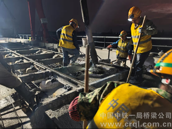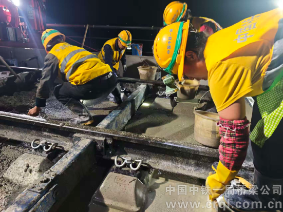 為確保施工質量安全,項目部提前組織人員勘察現場,針對長軌件吊裝、精準定位、混凝土澆筑等關鍵環節制定專項施工方案。施工過程中,技術團隊嚴格把控測量精度,采用專業設備將道岔安裝與軌距誤差控制在毫米級,并在現場人員的協調配合下分六次完成209余方混凝土澆筑及交叉作業銜接等工序,為后續鋪軌奠定了堅實基礎。