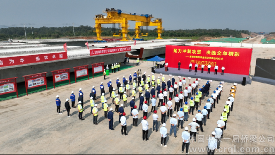 項目部預制架設雙線箱梁 605 孔,是全線預制和架梁數量最多的單位。施工中,項目部積極打通箱梁預制、運輸、架設三大關鍵環節,認真做好安全技術交底和培訓,嚴格執行現場帶班制度,對運架施工及機械設備運行維護等 關鍵環節做好全過程盯控,長期以日均制梁2.5孔、架梁3孔的速度領跑全線,助力全線箱梁架設突破1000孔,先后成為全線首家架梁過半、首家完成全部架梁施工的單位。