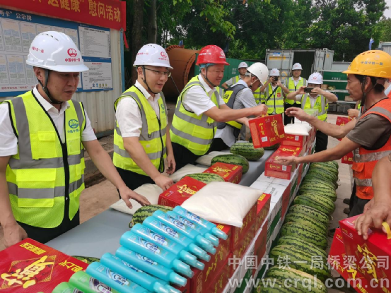 在花地河項目施工現場,劉輝代表公司工會向奮戰在一線的人員送上了礦泉水、涼茶、西瓜、綠豆等防暑降溫物品。他強調,高溫天氣室外施工人身安全是第一位,指揮部片區各項目要嚴格遵守夏季作息時間,盡量避免高溫時段戶外作業,同時要密切關注人員的身體狀況,確保所有作業人員在健康、安全的環境下正常作業。