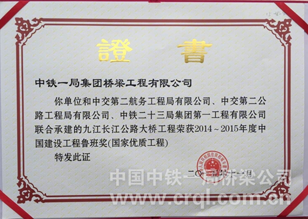2015年11月17日上午,由首都北京傳來了令人振奮的消息,在2014-2015年度中國建設(shè)工程魯班獎(jiǎng)(國家優(yōu)質(zhì)工程)經(jīng)驗(yàn)交流表彰大會(huì)的現(xiàn)場(chǎng),由中鐵一局集團(tuán)橋梁工程有限公司承建的九江長江公路大橋榮獲中國建筑行業(yè)工程質(zhì)量最高榮譽(yù)魯班獎(jiǎng)。橋梁公司安全總監(jiān)高虎軍和九江長江公路大橋項(xiàng)目經(jīng)理趙云峰出席了本次頒獎(jiǎng)典禮,并從頒獎(jiǎng)現(xiàn)場(chǎng)發(fā)回獲獎(jiǎng)盛況。