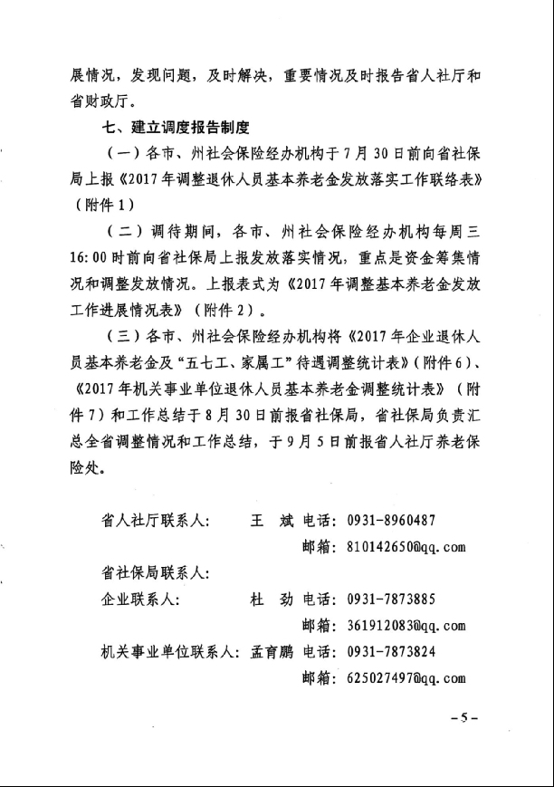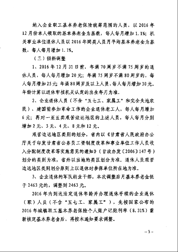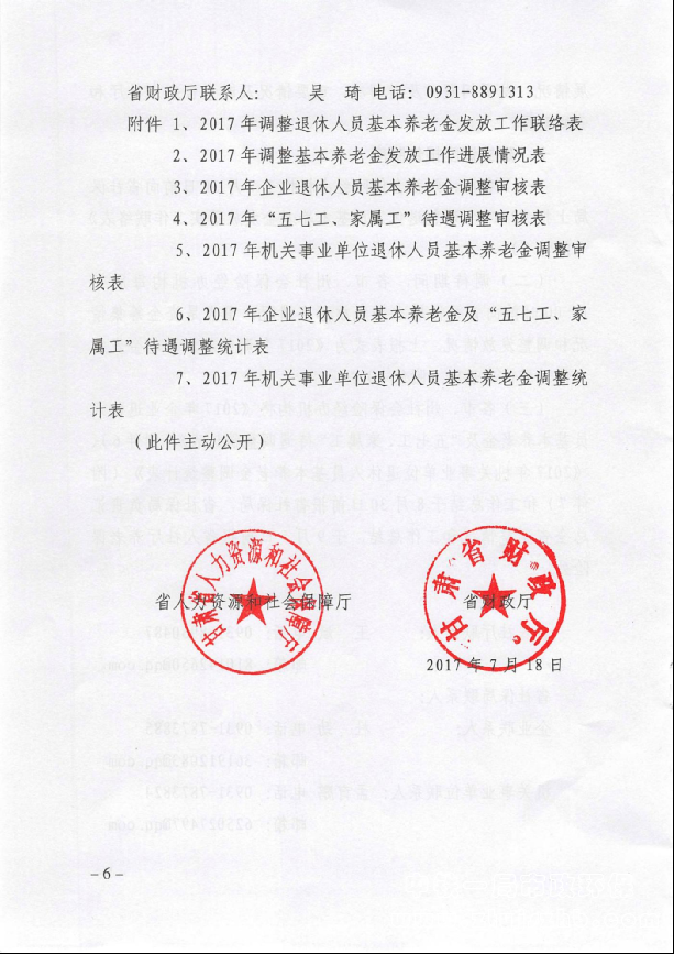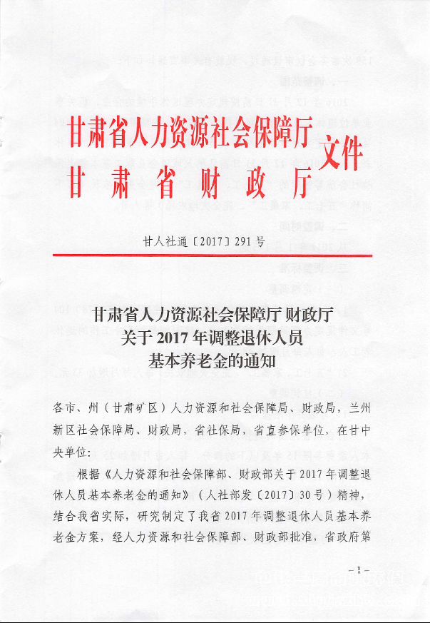 甘肅省人力資源社會保障廳 財政廳 關于2017年調整退休人員基本養老金的通知