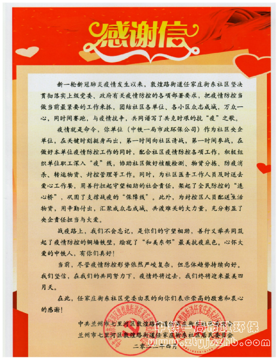 4月17日下午,蘭州市七里河區敦煌路街道任家莊街東社區工作人員給公司送來感謝信。信中對新一輪新冠肺炎疫情期間公司積極參加社區疫情防控工作,與社區群眾守望相助表示感謝。信中稱:公司積極組織職工深入“疫”線,協助社區做好核酸檢測、物資分揀、防疫消殺、轉運物資、封控管理等工作,充分彰顯了央企責任擔當與大愛。任務終有成,情誼永不斷,社區工作人員表示:希望公司能夠一如既往地關心和支持社區的全面發展,密切溝通交流。