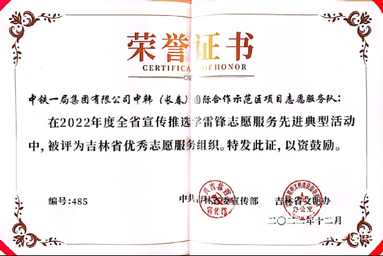 公司中韓(長春)國際合作示范區(qū)項目志愿服務隊榮獲“吉林省優(yōu)秀志愿服務組織” 榮譽稱號