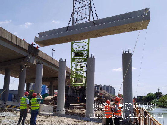7月14日上午6時,隨著指揮口令,架橋機吊起的一榀長22.90米、重達41噸的板梁以穩定的姿態,準確的落入兩端墩臺預設支座上,標志著由公司承建的上海G320公路跨G15沈海高速大橋首片板梁一次性架設成功,拉開該橋梁上部結構施工序幕。