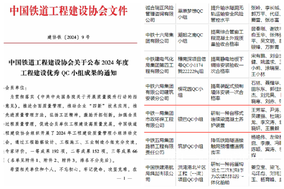 近日,從中國鐵道工程建設(shè)協(xié)會傳來喜訊,公司銀巴支線鐵路項目“銀巴QC小組”發(fā)布的《研制一種自移式連續(xù)梁混凝土養(yǎng)護裝置》成果,榮獲2024年度工程施工優(yōu)秀QC小組成果(國家級)“一等成果”榮譽稱號,并獲批國家知識產(chǎn)權(quán)局頒發(fā)的國家實用新型專利。同時該小組發(fā)布的《鉆孔樁樁頭破除工藝創(chuàng)新》成果,榮獲2024年度陜西省建筑業(yè)協(xié)會(省部級)優(yōu)秀QC小組成果“一等成果”。