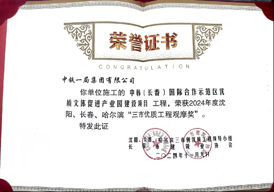 中韓(長春)國際合作示范區(qū)優(yōu)質(zhì)文體促進(jìn)產(chǎn)業(yè)園建設(shè)項(xiàng)目榮獲2024年度沈陽、長春、哈爾濱“三市優(yōu)質(zhì)工程觀摩獎(jiǎng)”