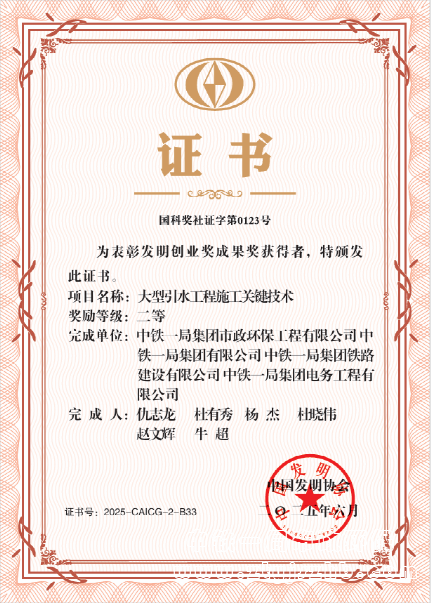 大型引水工程施工關(guān)鍵技術(shù)獲發(fā)明創(chuàng)業(yè)獎(jiǎng)二等獎(jiǎng)