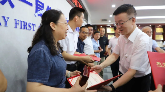 活動現(xiàn)場,張海龍、尹匯輝以及其他黨委委員把刻有“光榮退休”字樣的紀(jì)念章以及證書頒發(fā)給退休職工。閃耀的獎?wù)?,是對每名退休職工的高度評價和敬意。