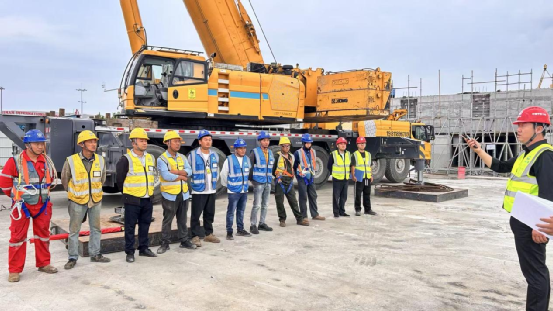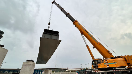 在工程推進中,作業點左側緊鄰機場運營中的交通要道,右側為施工便道,場地狹小、環境復雜。為保障作業萬無一失,施工團隊以“精細化管控”為核心,結合現場實際反復推演吊裝方案,對設備選型、吊點設置、應急預案等環節逐一優化;施工期間實時跟進節點進度,從構件進場檢驗到吊裝精度校準,每一步均落實質量與安全雙管控,實現首節段幾乎零偏差安裝。