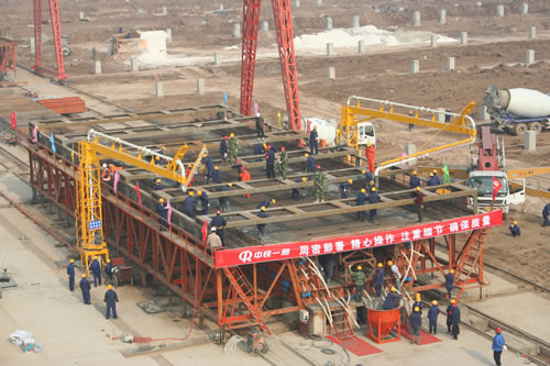 設計時速350公里/小時的鄭西客運專線是我國目前在建的世界一流水平的鐵路之一,32米無碴軌道單箱雙線箱梁是目前國內客專、高速鐵路采用的主導梁型,施工工藝新、技術難度大、科技含量高,在國內尚屬首次生產。橋梁一是梁體大:長32.6米,寬13.4米,高3.05米,超過一個標準籃球場;二是噸位重:單跨箱梁重819.5噸,是我國目前單件不可分最大噸位鐵路混凝土橋梁,一跨橋梁自重相當于過去所制4孔橋梁的重量,僅鋼筋用量就達60余噸。綁扎、張拉、移梁等工序與傳統工藝完全不同,要求非常嚴格,澆注必須不間斷進行,在6小時內一次完成,工藝相當復雜。三是科技含量高,制作標準嚴:單跨使用混凝土320立方,鋼筋54噸,鋼絞線10噸,總重量819噸,具有耐久性、耐腐蝕、抗凍性能高等特點,設計使用壽命100年。相比1999年開工建設的秦沈客運專線無論從技術含量、還是施工難度上都提出了更高的要求采用大量的新技術、新材料、新工藝,誤差以毫米計,許多都是以往制梁所沒有的,因此制作難度大。