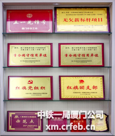 因標準化建設成效顯著,項目部各項工作變得更加順暢,各種榮譽也接踵而至,獲得廈門市“無欠薪標桿項目部”、廈門市“五一先鋒號”、廈門市“揚塵考評第一名”、中國中鐵綠色施工科技示范工程、中鐵一局“紅旗黨組織”稱號等;在廈門軌道集團半年度信用評價中兩次獲得第一名好成績,被授予“重合同守信用單位”金色牌匾;在中鐵南方投資集團信用評價中取得第一名好成績;工程建設亮點等被工人日報、廈門晚報、廈門日報等多家媒體相繼報道。